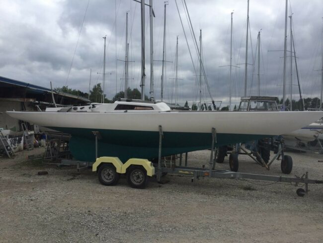 Chantier : Moinard, Année : 1988 Prix : 23 000 euros Coque polyester Pont en teck Remorque : Atlas double-essieux 1986 Equipements : Grand-Voile, Génois, Foc, spi dacron : Bon état Chaise moteur HB, spéciale pour requin Bouée fer à cheval Mouillage Amarres Araignée de GV Housse de GV Avirons Compas Girouette Intérieur refait à…
