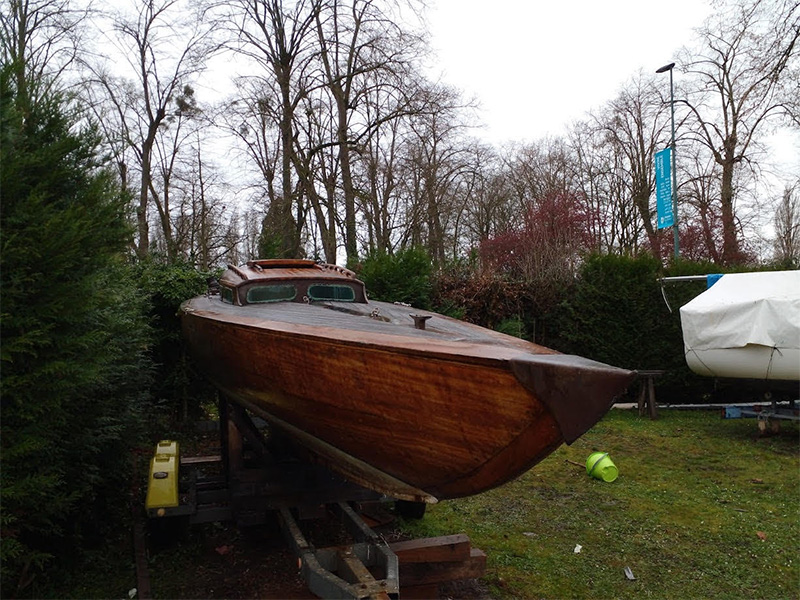 Requin en acajou nécessitant une grosse restauration. Le pont est plutôt correct, les bordés en acajou aussi mais le brion est à changer. Mat en spruce, bôme rouleuse…