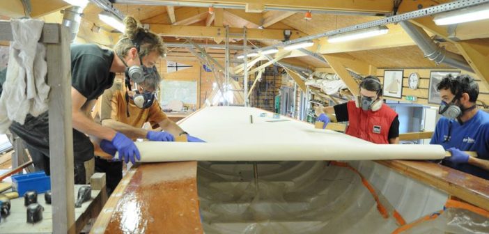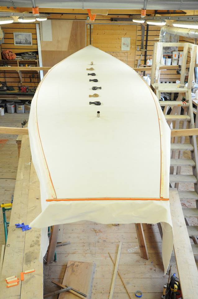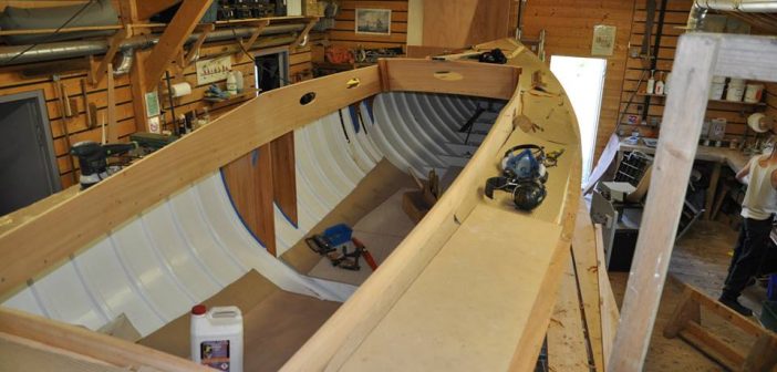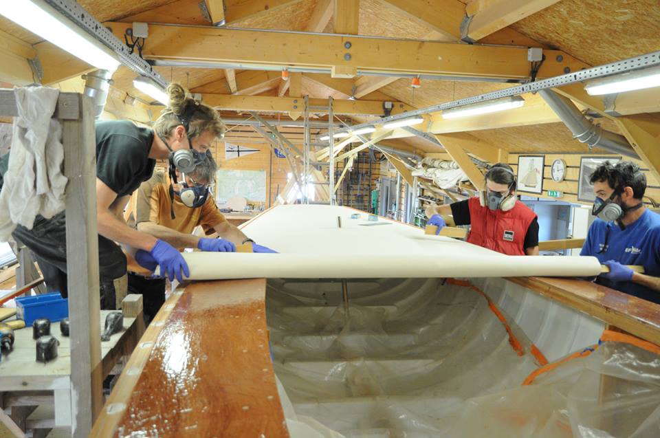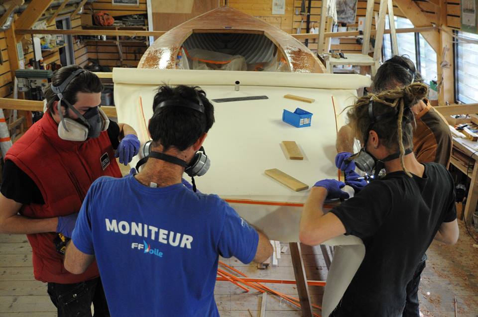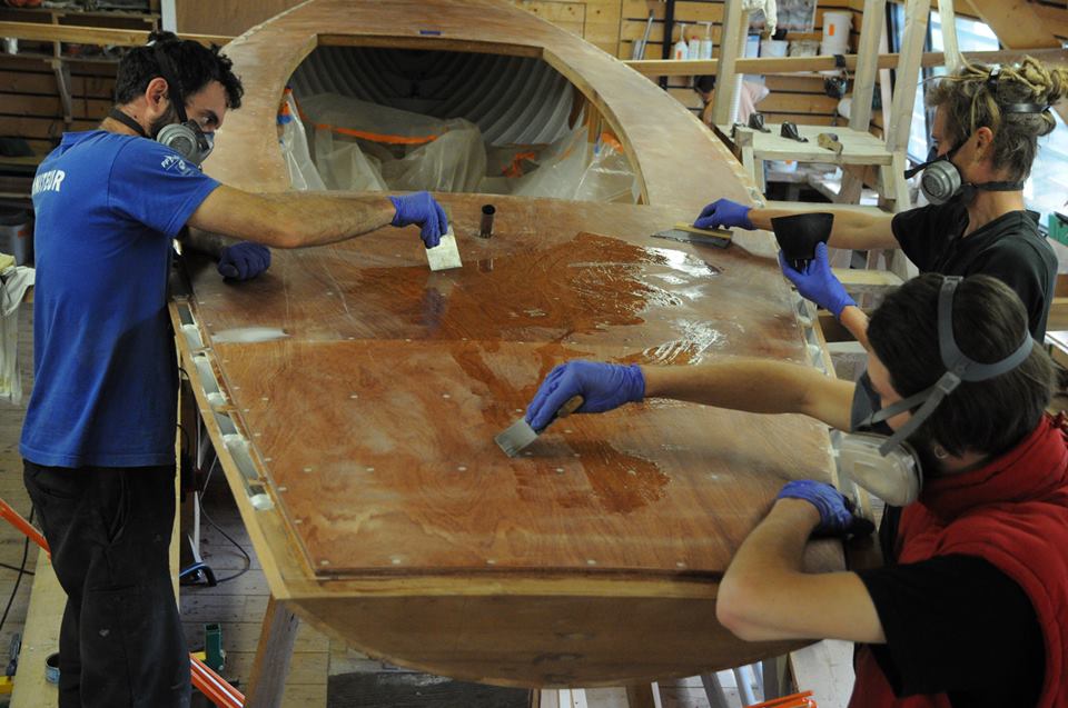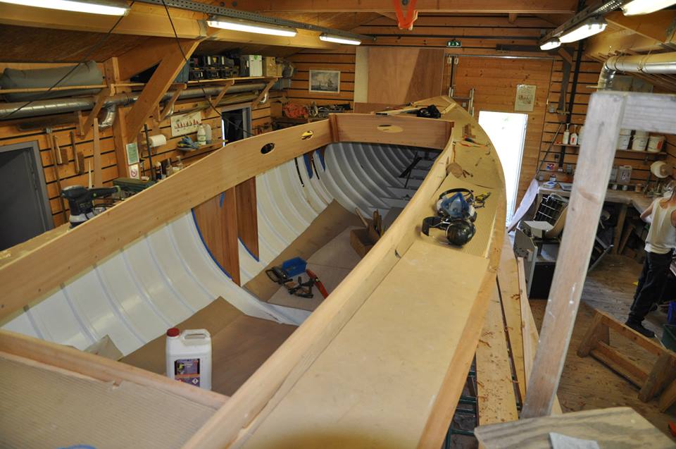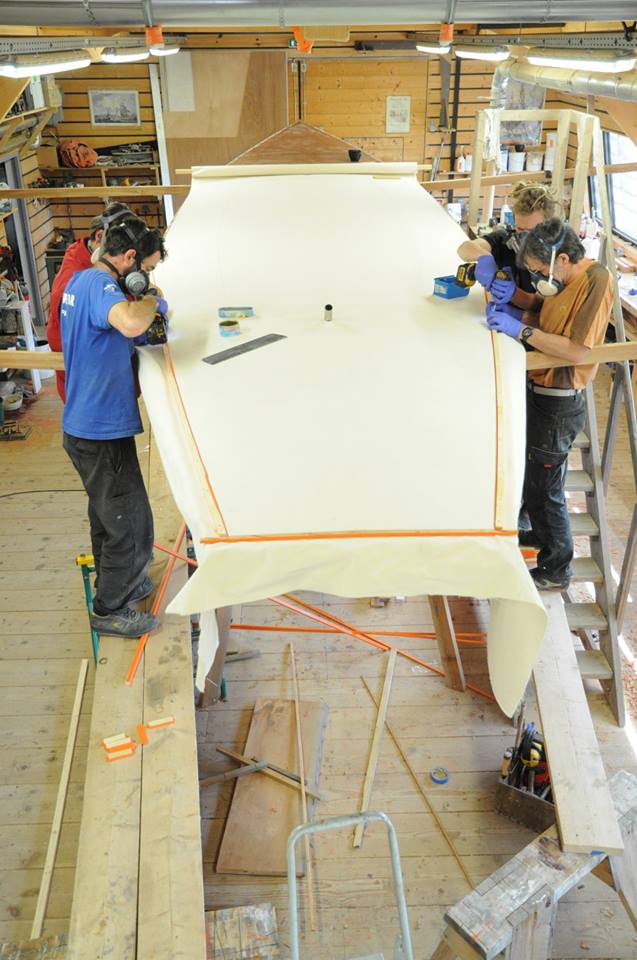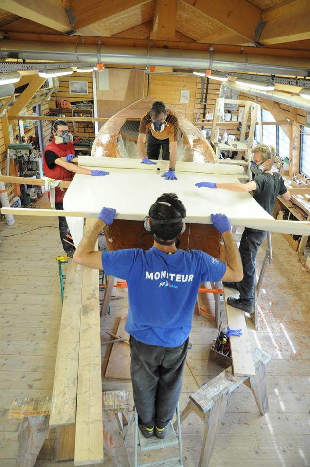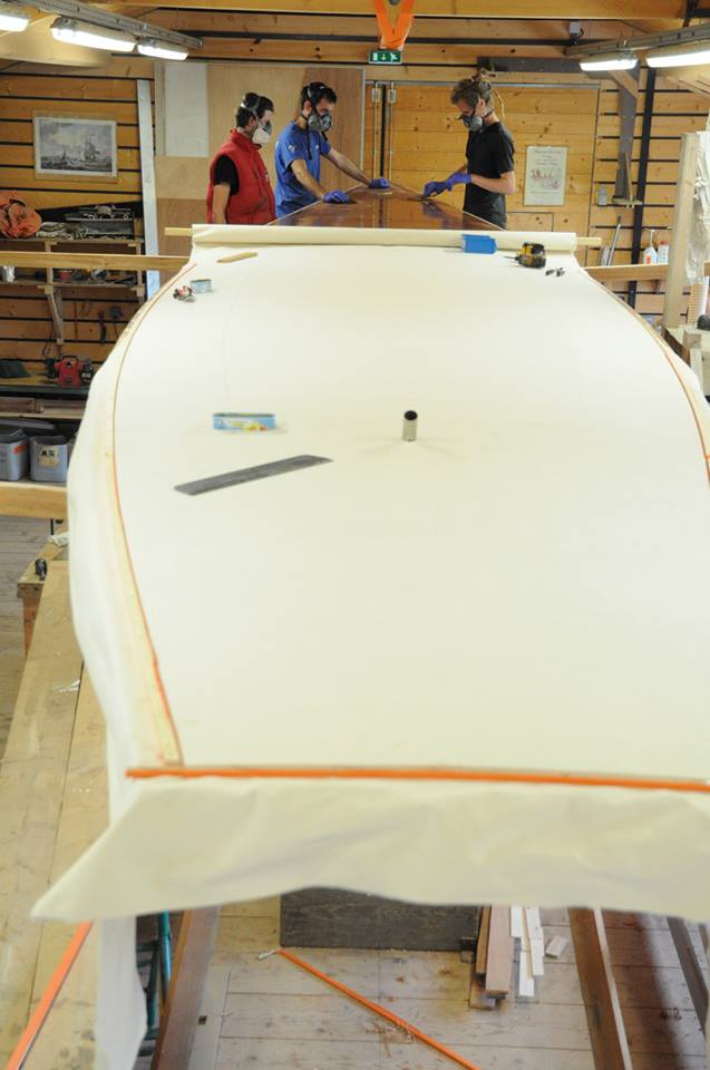 L’équipe de stagiaires de Skol Ar Mor va bientôt attaquer la pose du pont du futur Requin bois. Le barrotage est maintenant terminé, les courbes horizontales ont été fixées et les barrots et la serre-bauquière ont reçu leurs premières couches de vernis.