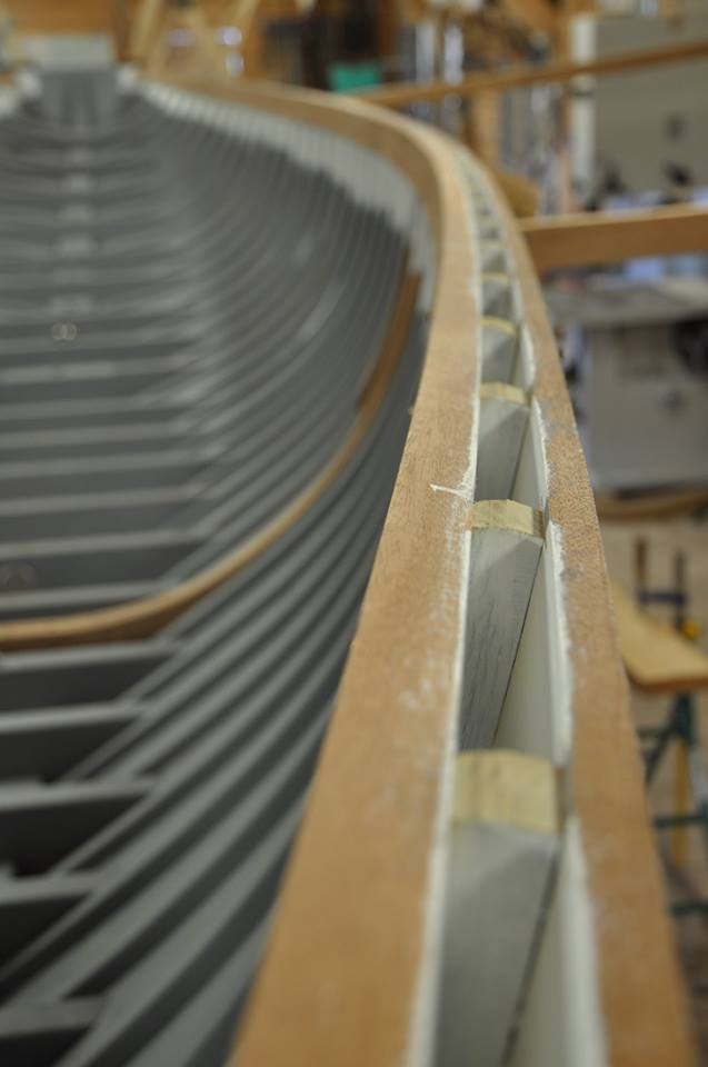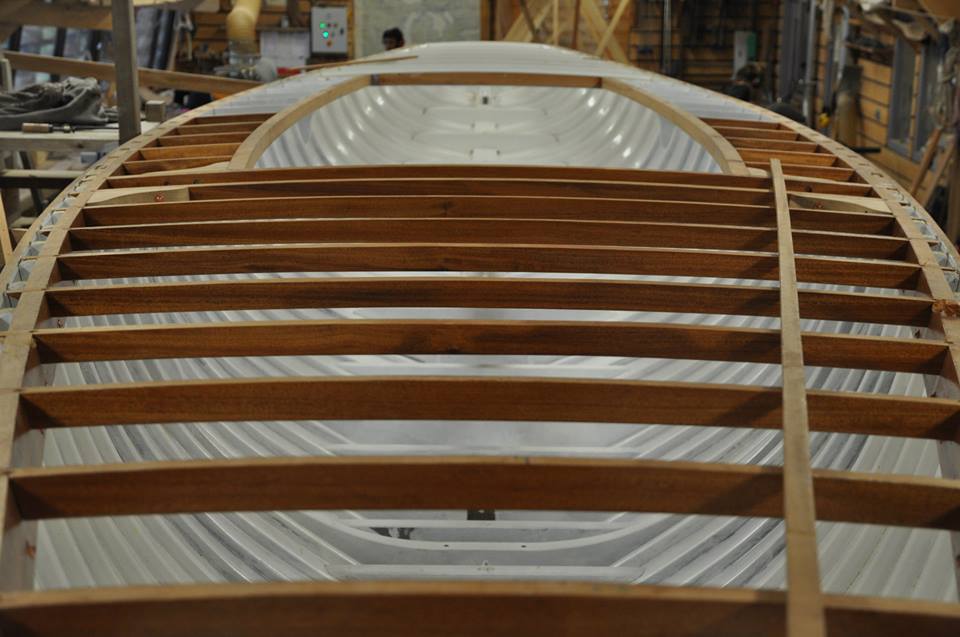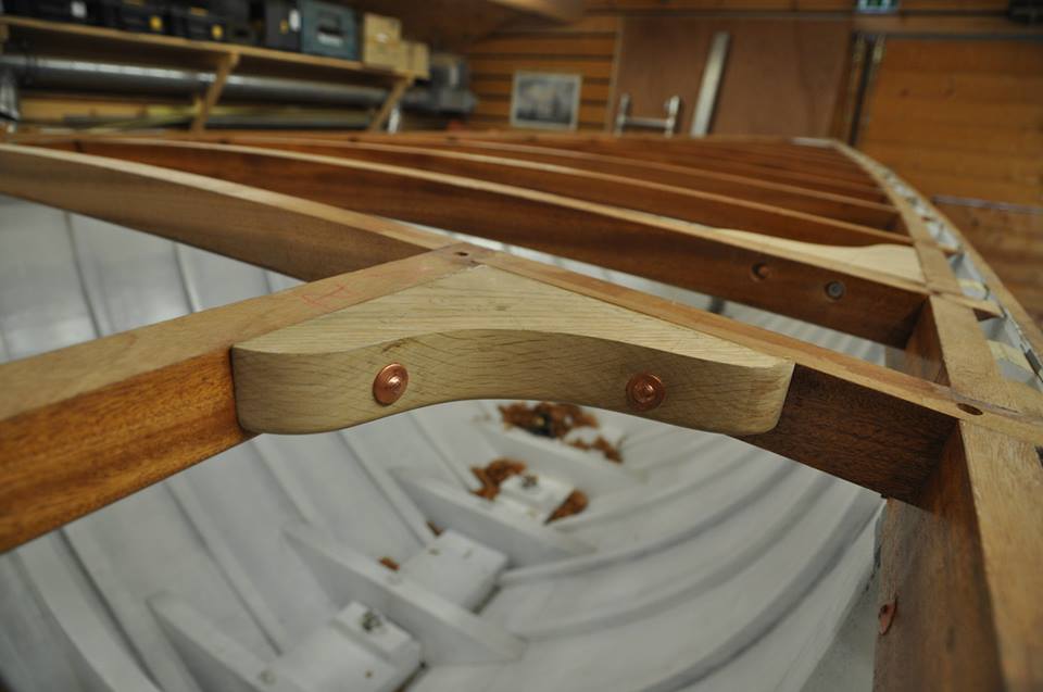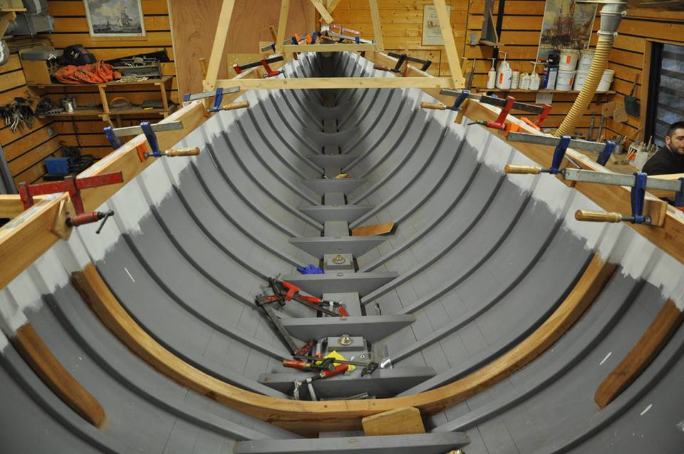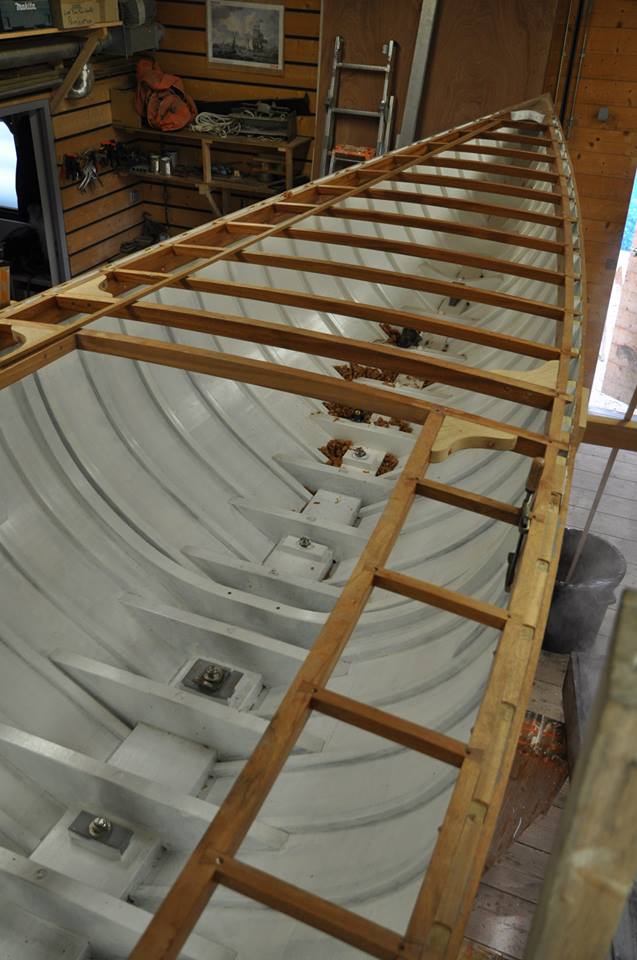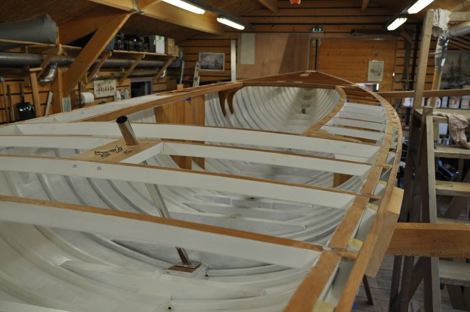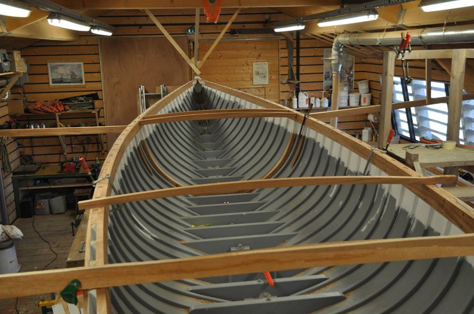 Notre Requin Skol Ar Mor progresse et de nouvelles photos viennent illustrer les dernières avancées. Avant d’entamer la construction du pont, les derniers jours ont vu la pose de renforts de cadènes en lamellé collé et de la serre bauquière, sorte de membrure longitudinale qui soutien les barrots. Les premières couches de peinture ont également été posées.