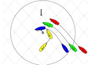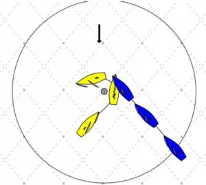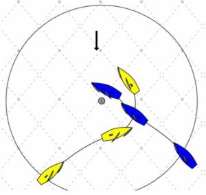 Jaune se retrouve sur le même bord que Bleu. Il enroule la marque en route libre devant Bleu qui lui la pare. Bleu n’a pas eu besoin de naviguer au-delà du plus près pour éviter le contact.