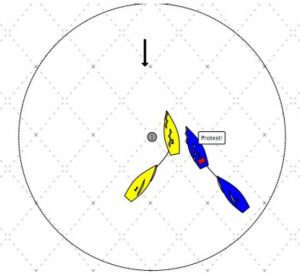 Jaune dépasse la position bout au vent et se retrouve sur le même bord que Bleu qui pare la marque. Cependant pour éviter le contact, Bleu est obligé de naviguer au-delà du plus près. Bleu proteste et envoie un pavillon rouge !