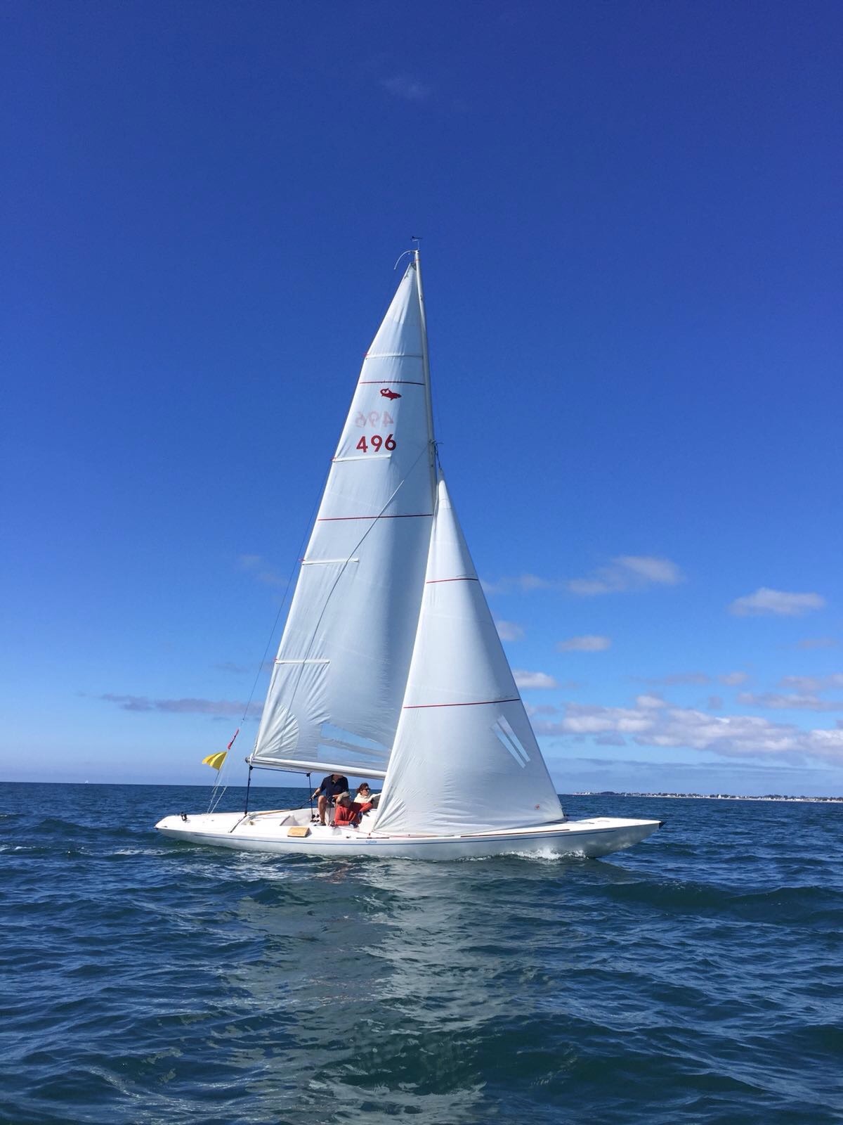 Samedi : pique-nique à l’île des Moutons sur les bateaux. Très sympa, temps superbe, mes équipiers se sont baignés. Aller et retour en parcours côtiers : les chevaux de bois , le classement à l’arrivée étant celui à la bouée de dégagement. Courant très fort au départ le matin et à l’arrivée le soir. Des postes difficiles à prendre avec le courant et le vent erratiques. Certains ne pouvant quitter à la voile leur emplacement sans aide. Nous nous étions obligés de déplacer le bateau en bout de ponton pour pouvoir partir à la voile.